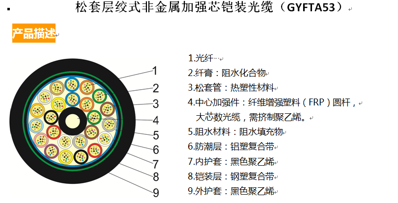 将单模或多模光纤套入高模量的聚酯材料做成的松套管中,套管内填充防水化合物。缆芯的中心是一根金属加强芯,对于某些芯数的光缆来说,金属加强芯外还需挤上一层聚乙烯(PE)。松套管(和填充绳)围绕中心加强芯绞合成紧凑的圆形缆芯,缆芯内的缝隙充以阻水填充物。双面镀铬涂塑钢带(PSP)纵包后挤制聚乙烯护套成缆。
